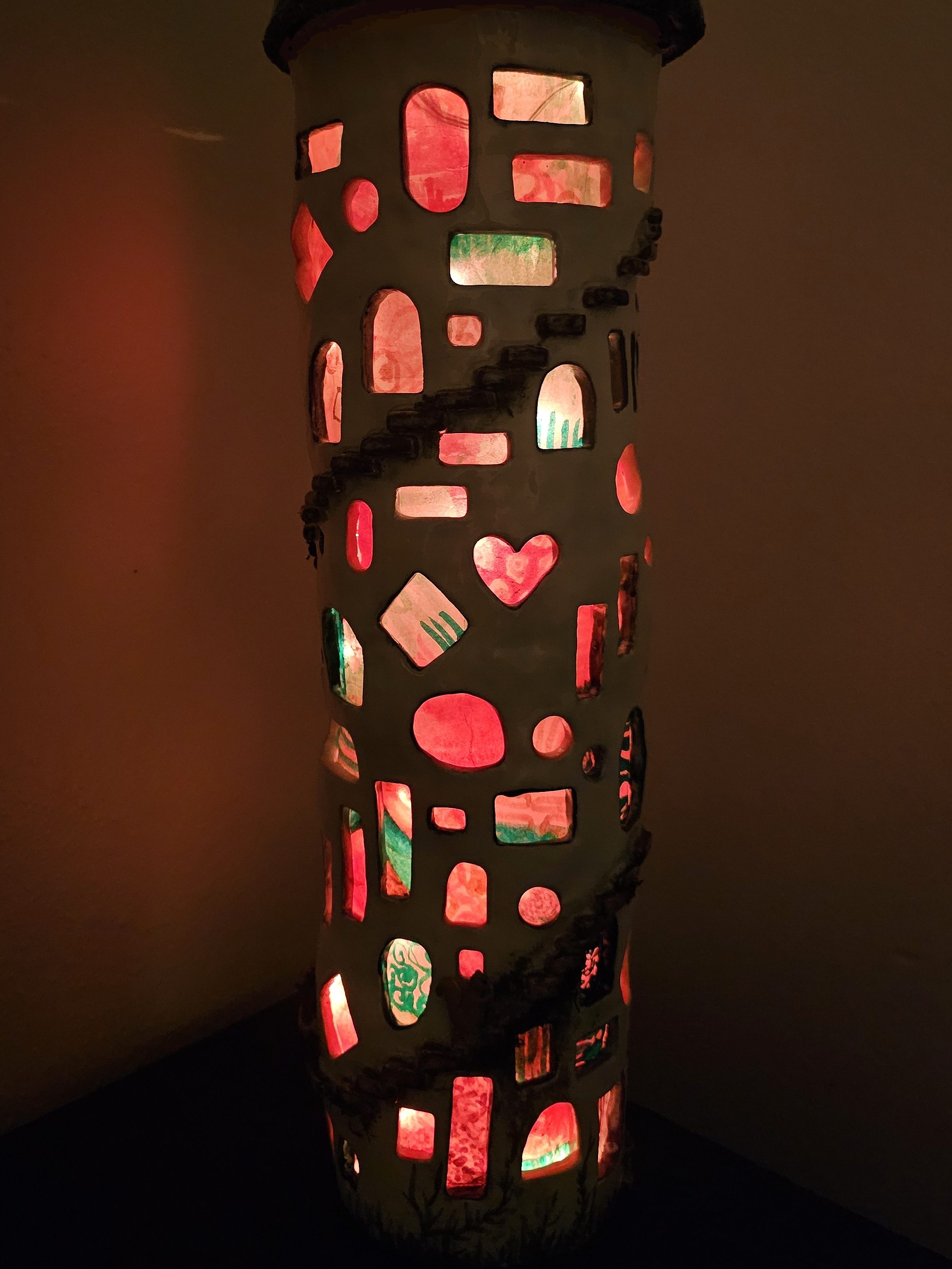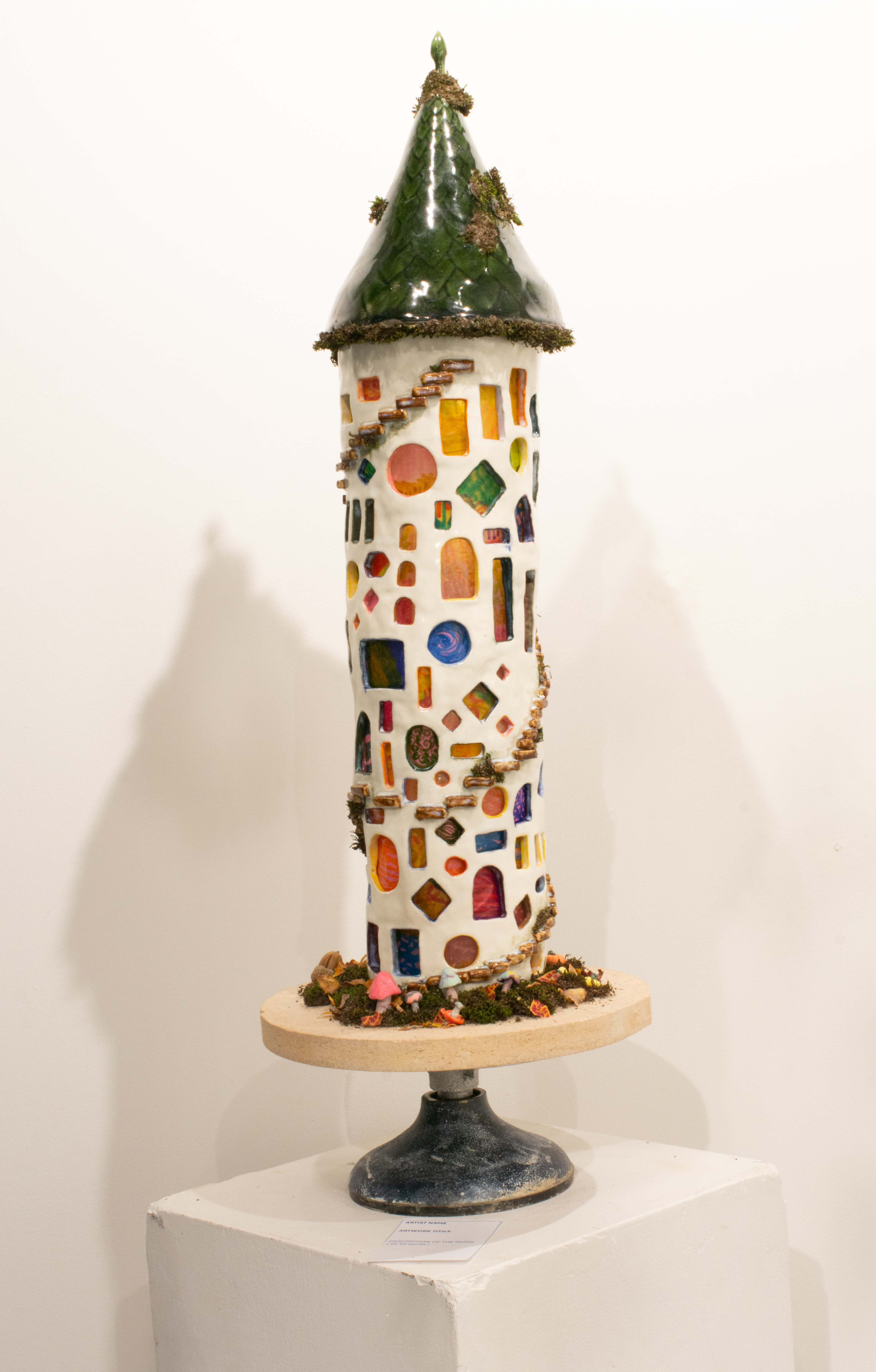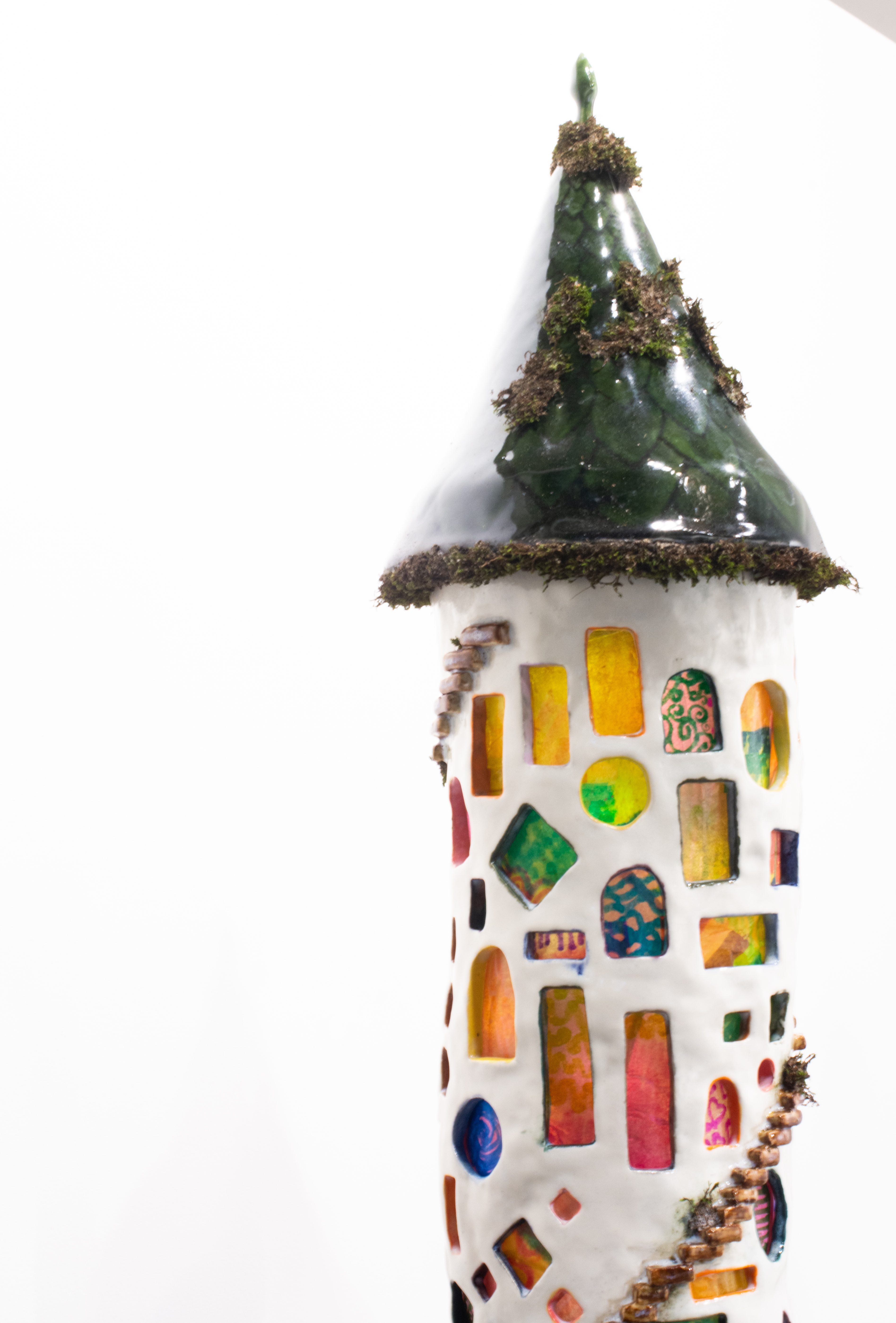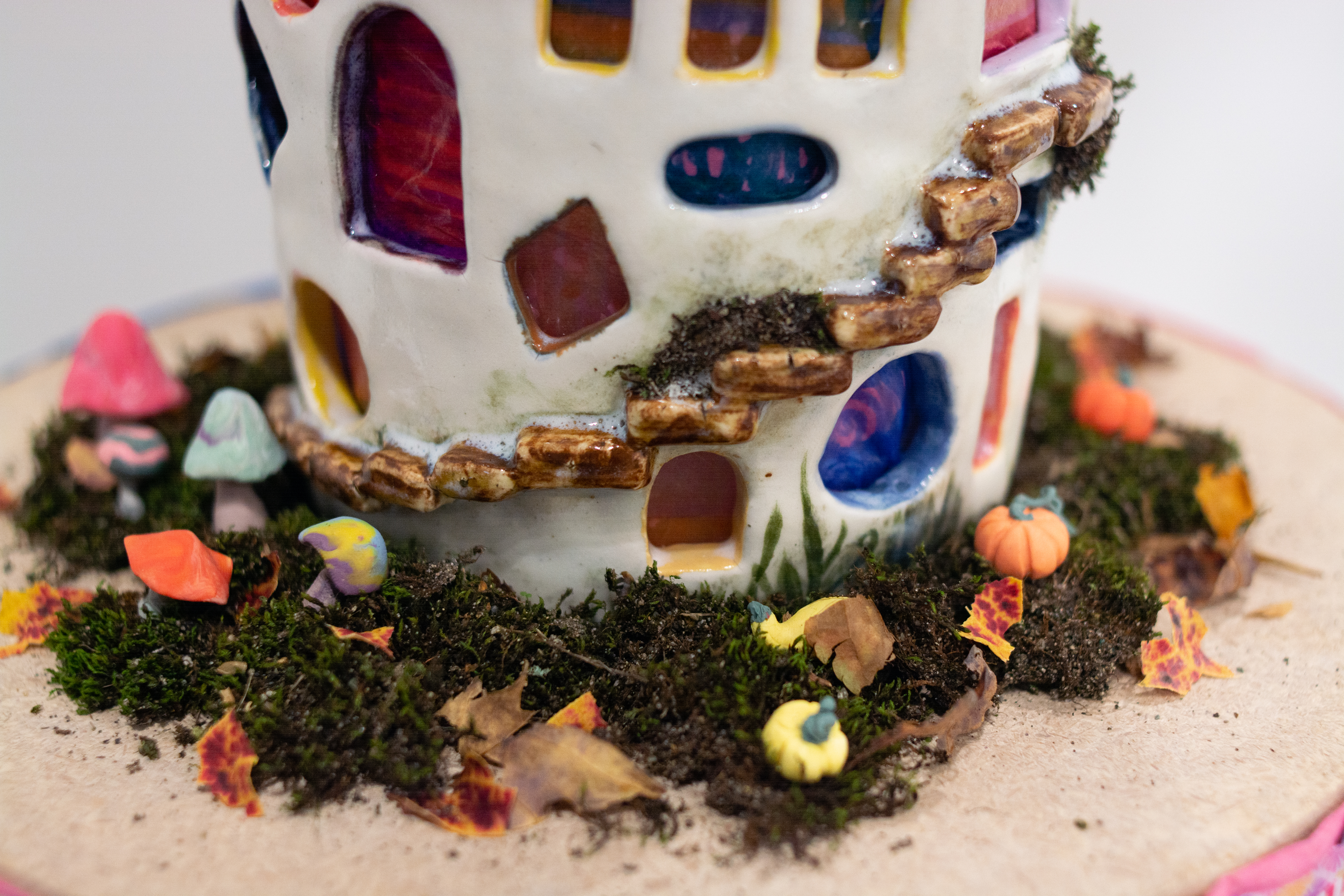 Exploring the theme of repetition, “100 Windows into My Soul” is a representation of my inner being. The 103 stained glass windows are adorned with different swirling patterns that emanate a soft pink orange light in the dark. Individually sculpted stairs spiral around the tower, with various critters scurrying along. At the base of the tower, fungi, mosses, and decomposing leaves create a vibrant ecosystem, complete with live microbial activity. The structure itself is a 23-inch coil-built tower with a slab-rolled roof, featuring polymer clay flora and fauna, along with living moss.
