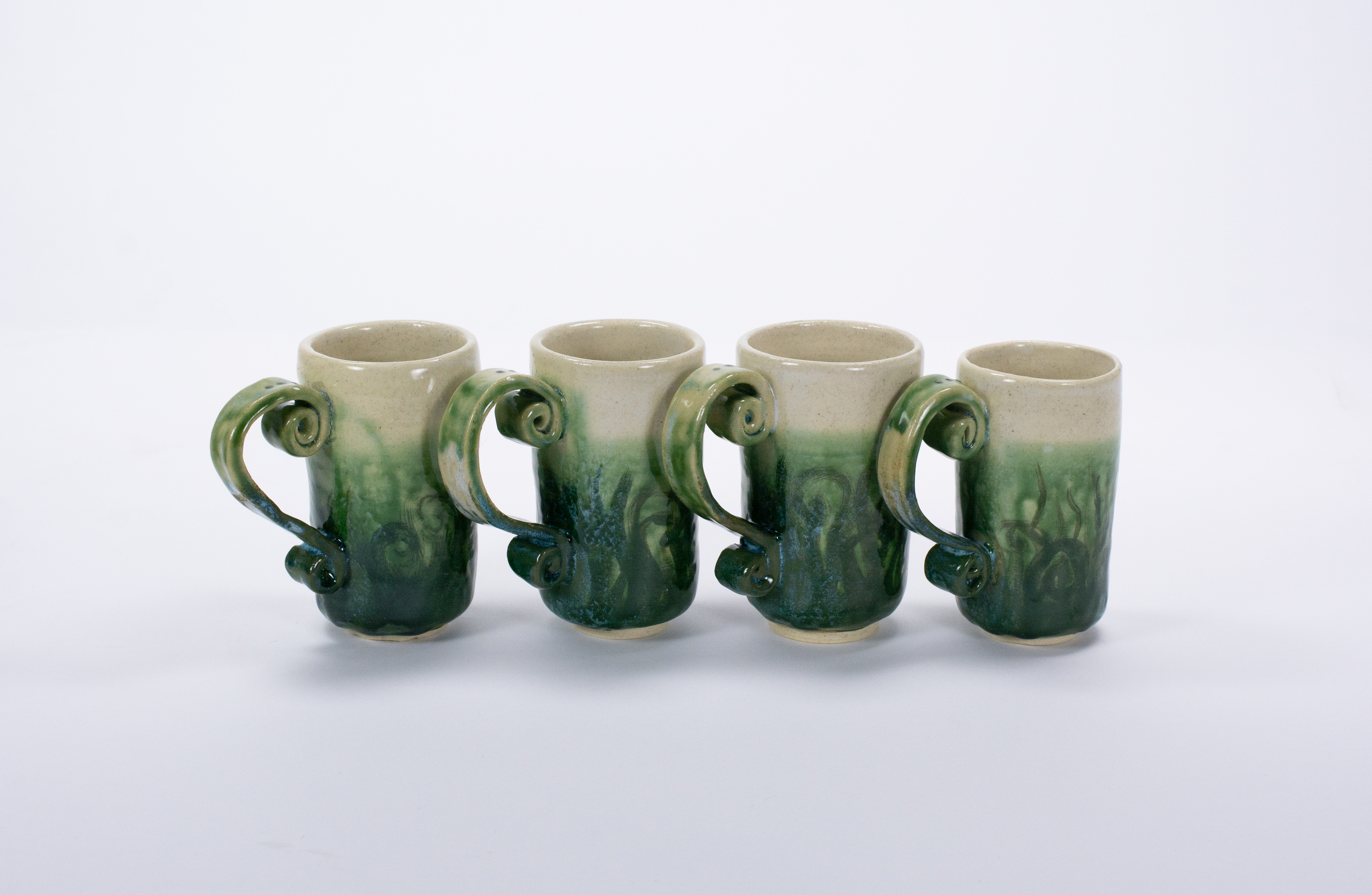 This wheel thrown teapot set includes four 10 oz mugs, all sculpted and painted with fiddlehead ferns. The white stoneware was dipped in a bold green glaze. The teapot features a gooseneck spout with a classic, arching flow.